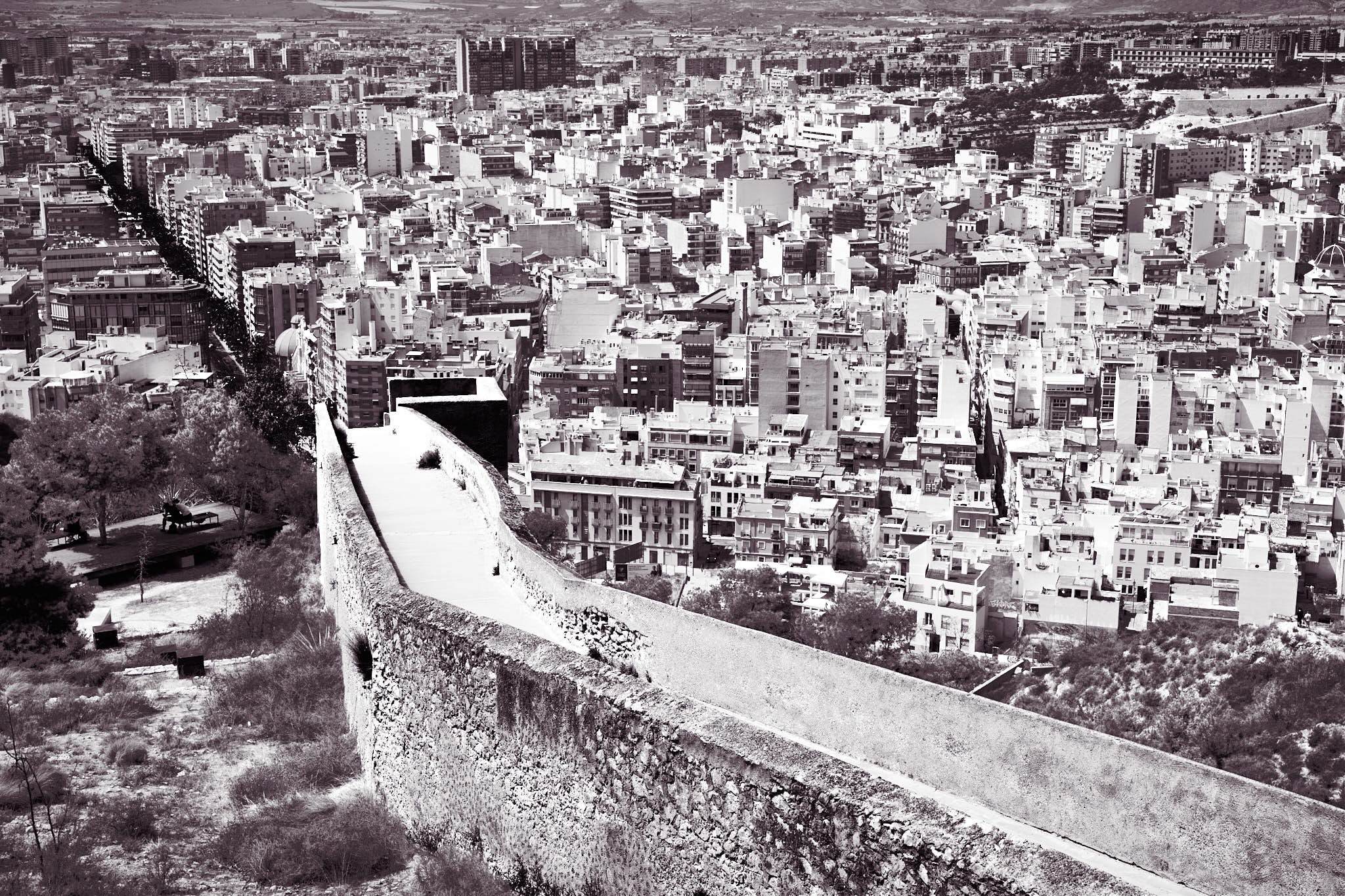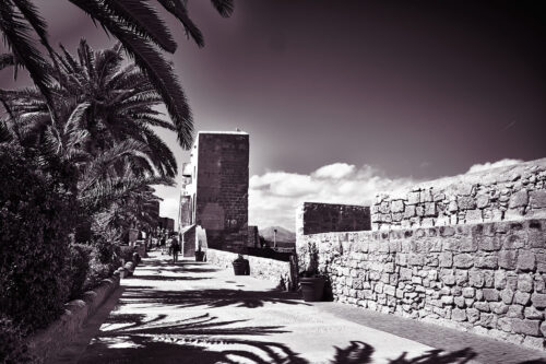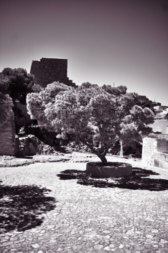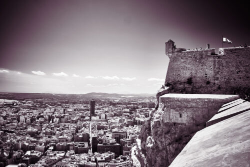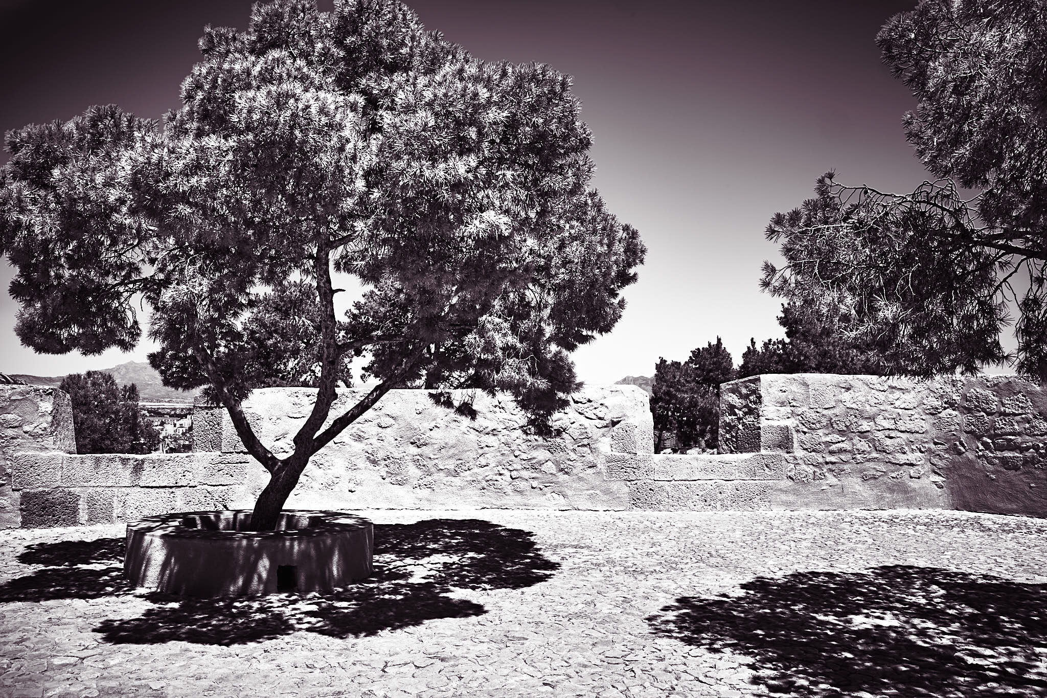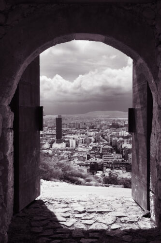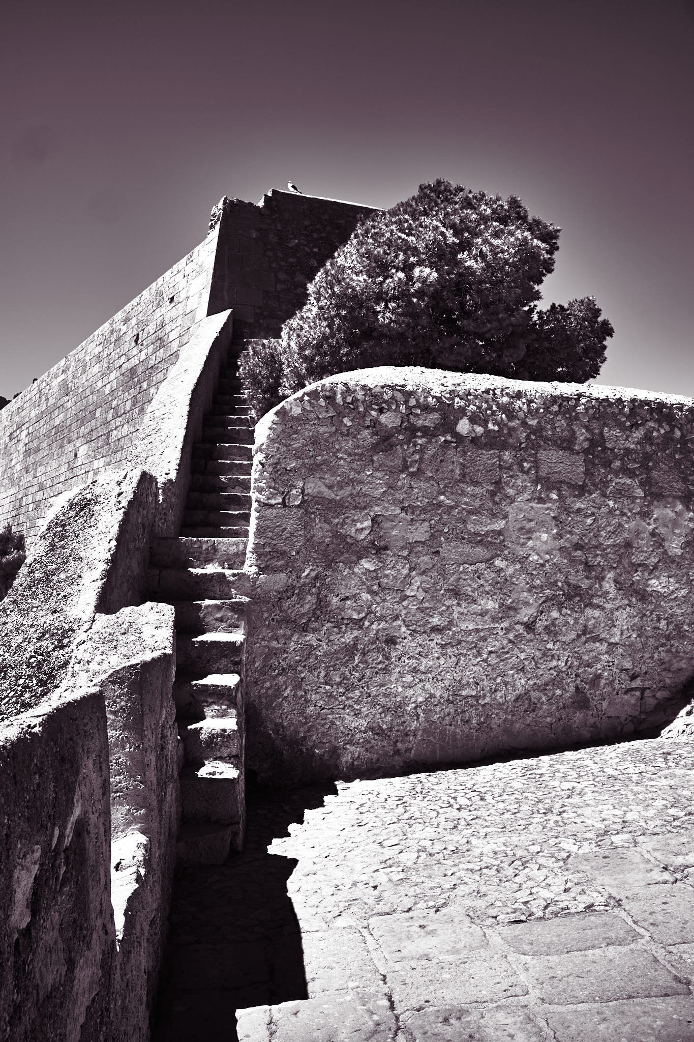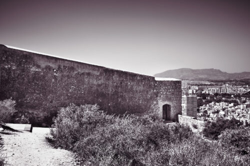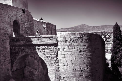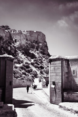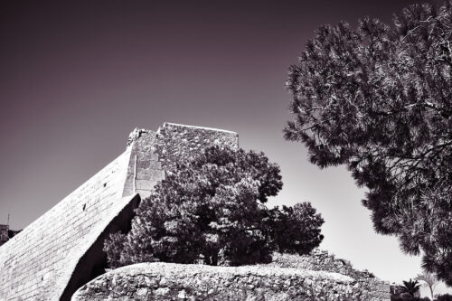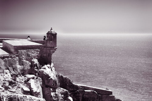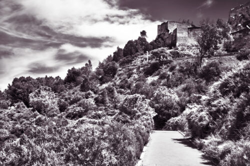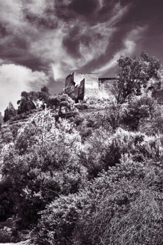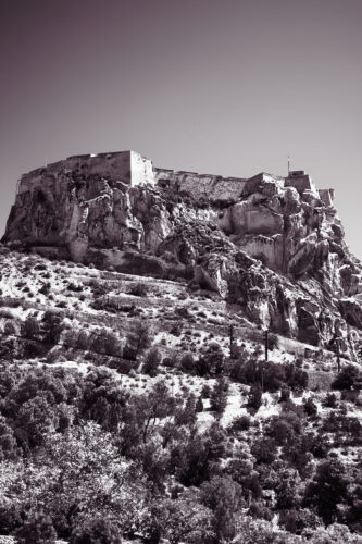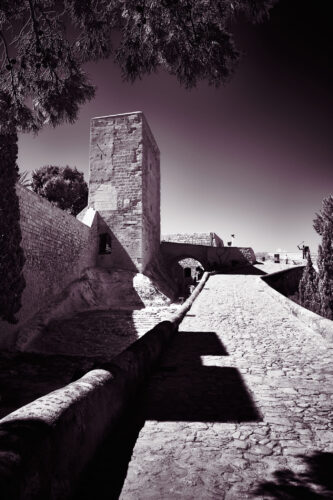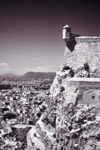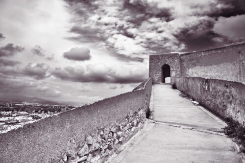 En noir et blanc, la forteresse de Santa Bárbara se dépouille de toute chaleur.