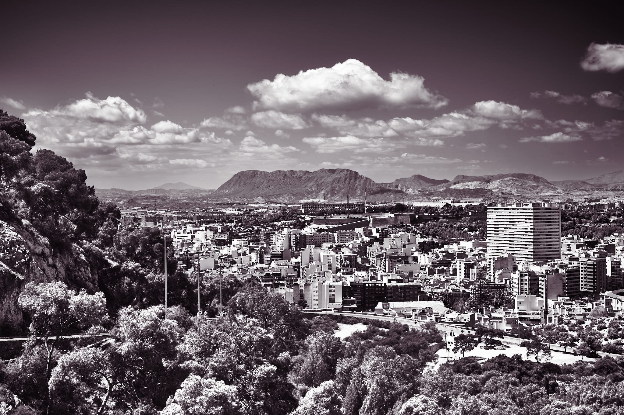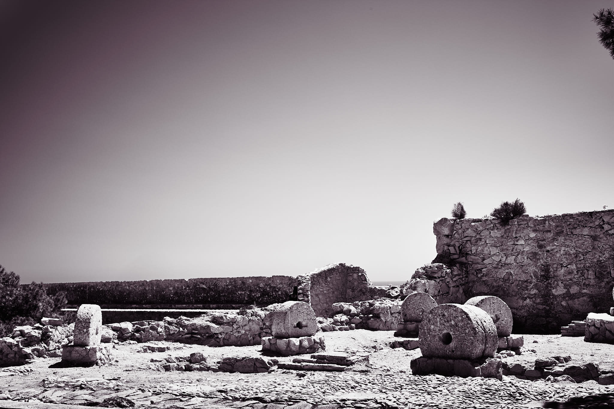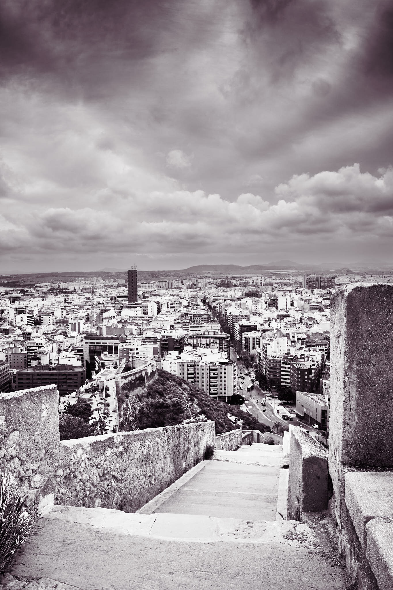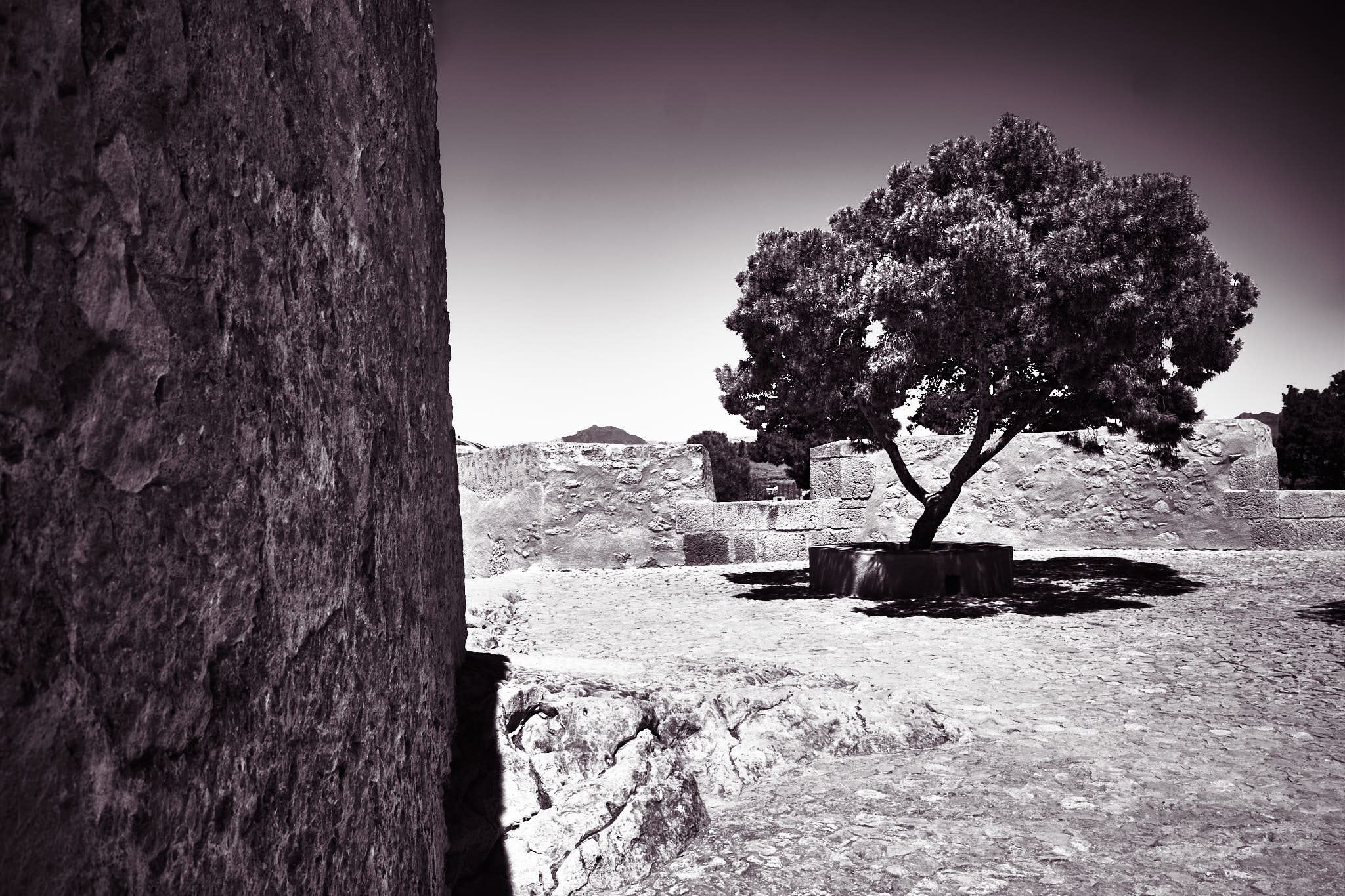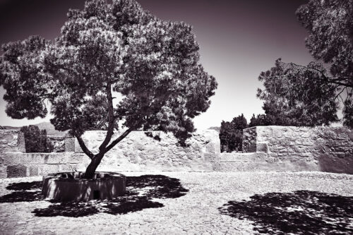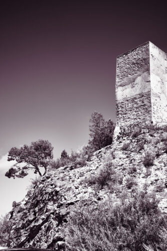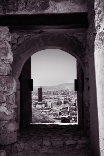 En noir et blanc, la forteresse de Santa Bárbara se dépouille de toute chaleur.