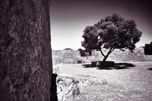 La forteresse, dépouillée, se transforme en idée plus qu’en image : la permanence de la matière face à l’éphémère de la lumière.