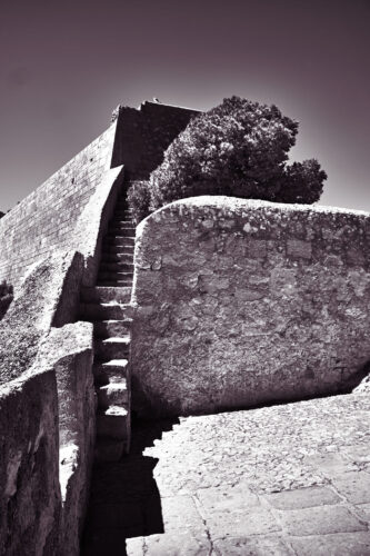 Les marches, les créneaux, les pans de mur forment une suite de plans inclinés, une partition d’ombres portées.