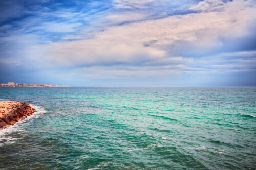 Alicante, vue d’ici, se simplifie : une étendue blanche posée sur la mer.