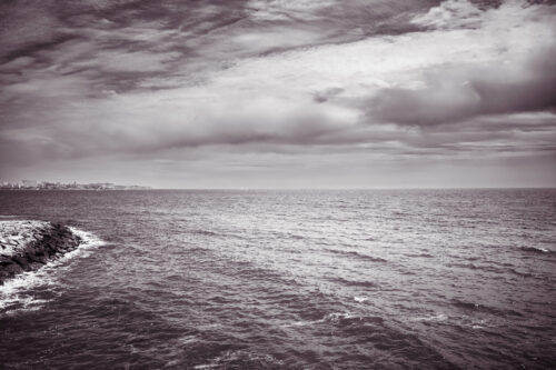 La mer s’étend sans limite, la côte se perd, la ville recule.