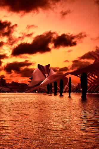 Les courbes de Calatrava, les bassins d’eau, les surfaces vitrées offrent à la photographie une matière fascinante : le dialogue entre la précision architecturale et la fluidité du ciel.