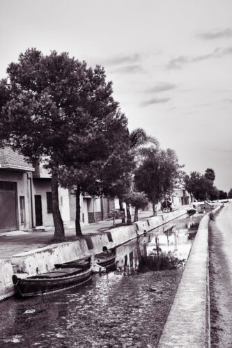 Les barques, alignées comme en attente, racontent un usage ancien ; les murs blanchis, la fatigue du soleil.