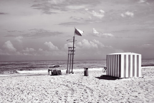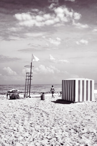 Blanche, carrée, un peu vieillie par le sel, elle évoque les plages du nord, celles de la côte belge — mêmes lignes, même simplicité fonctionnelle, même impression d’abandon provisoire.
